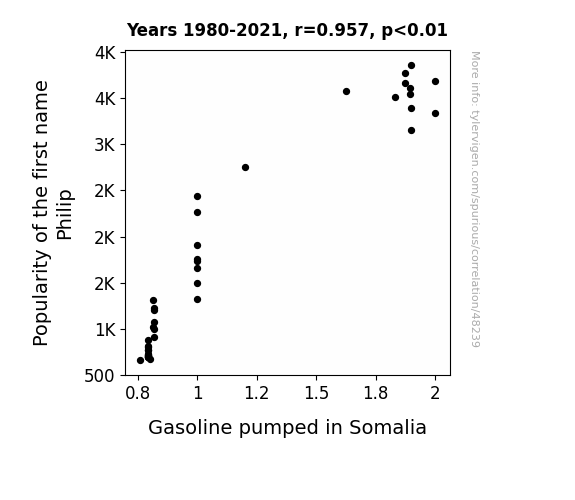 This means 91.6% of the change in the one variable (i.e., Gasoline pumped in Somalia) is predictable based on the change in the other (i.e., Popularity of the first name Philip) over the 42 years from 1980 through 2021.