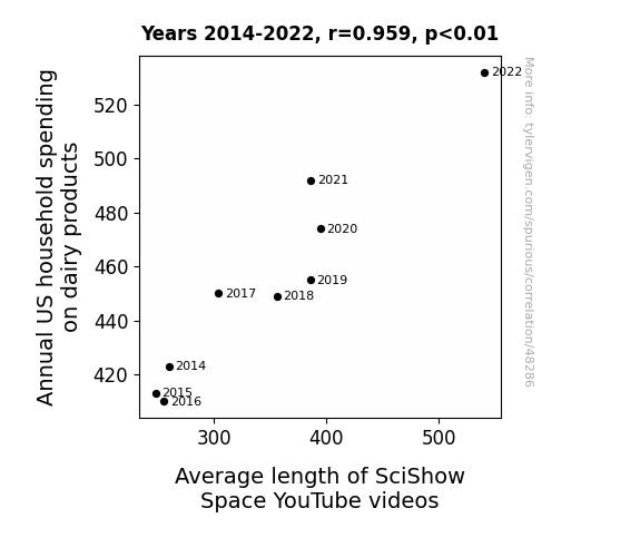 This means 91.9% of the change in the one variable (i.e., Average length of SciShow Space YouTube videos) is predictable based on the change in the other (i.e., Annual US household spending on dairy products) over the 9 years from 2014 through 2022.
