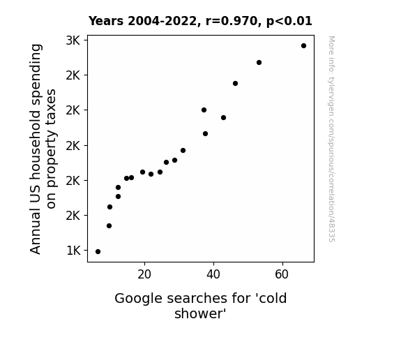 This means 94.1% of the change in the one variable (i.e., Google searches for 'cold shower') is predictable based on the change in the other (i.e., Annual US household spending on property taxes) over the 19 years from 2004 through 2022.
