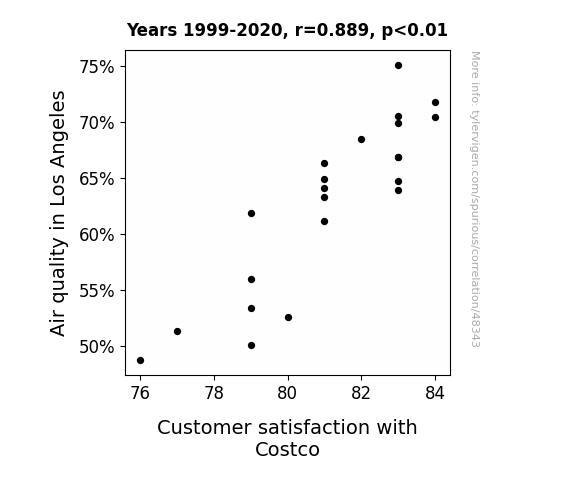 This means 79.1% of the change in the one variable (i.e., Customer satisfaction with Costco) is predictable based on the change in the other (i.e., Air quality in Los Angeles) over the 22 years from 1999 through 2020.