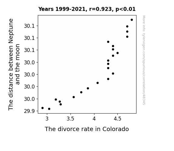 This means 85.2% of the change in the one variable (i.e., The divorce rate in Colorado) is predictable based on the change in the other (i.e., The distance between Neptune and the moon) over the 23 years from 1999 through 2021.