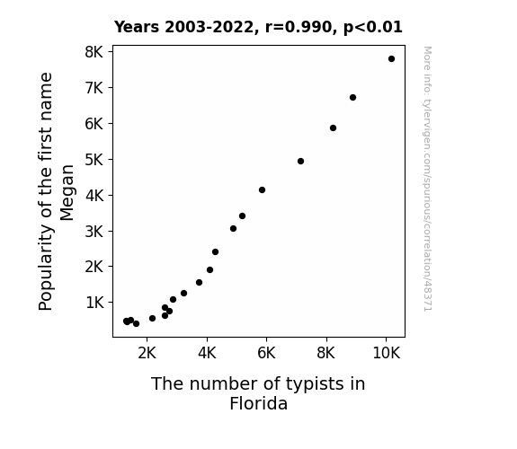 This means 98.1% of the change in the one variable (i.e., The number of typists in Florida) is predictable based on the change in the other (i.e., Popularity of the first name Megan) over the 20 years from 2003 through 2022.