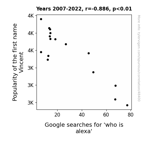 This means 78.5% of the change in the one variable (i.e., Google searches for 'who is alexa') is predictable based on the change in the other (i.e., Popularity of the first name Vincent) over the 16 years from 2007 through 2022.