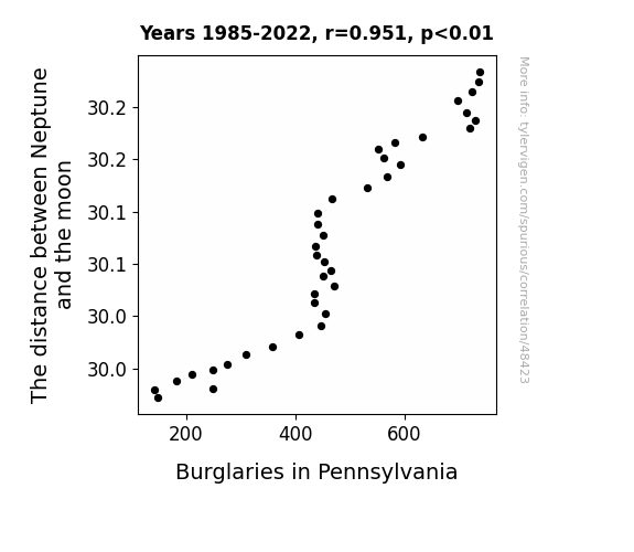 This means 90.4% of the change in the one variable (i.e., Burglaries in Pennsylvania) is predictable based on the change in the other (i.e., The distance between Neptune and the moon) over the 38 years from 1985 through 2022.