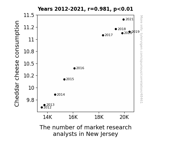 This means 96.2% of the change in the one variable (i.e., The number of market research analysts in New Jersey) is predictable based on the change in the other (i.e., Cheddar cheese consumption) over the 10 years from 2012 through 2021.