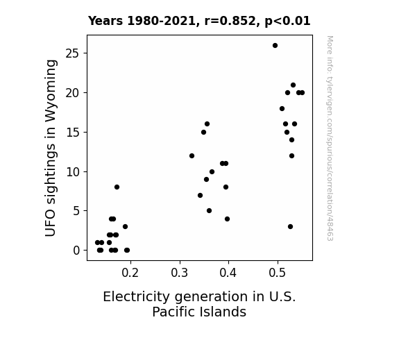 This means 72.7% of the change in the one variable (i.e., Electricity generation in U.S. Pacific Islands) is predictable based on the change in the other (i.e., UFO sightings in Wyoming) over the 42 years from 1980 through 2021.