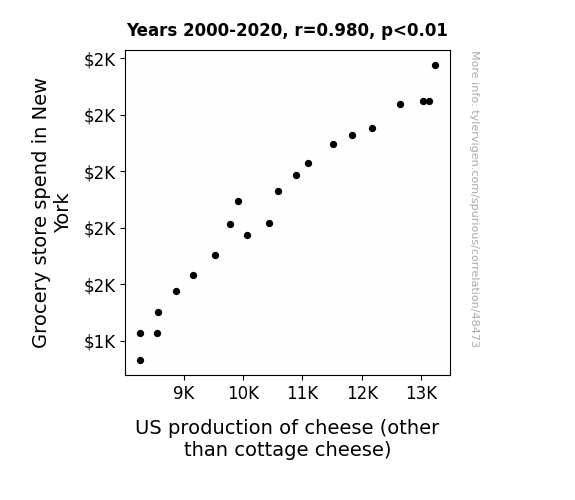 This means 96% of the change in the one variable (i.e., US production of cheese (other than cottage cheese)) is predictable based on the change in the other (i.e., Grocery store spend in New York) over the 21 years from 2000 through 2020.