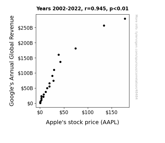 This means 89.4% of the change in the one variable (i.e., Apple's stock price (AAPL)) is predictable based on the change in the other (i.e., Google's Annual Global Revenue) over the 21 years from 2002 through 2022.