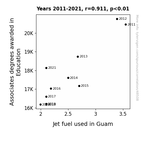This means 83.1% of the change in the one variable (i.e., Jet fuel used in Guam) is predictable based on the change in the other (i.e., Associates degrees awarded in Education) over the 11 years from 2011 through 2021.