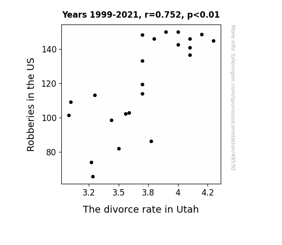 This means 56.5% of the change in the one variable (i.e., The divorce rate in Utah) is predictable based on the change in the other (i.e., Robberies in the US) over the 23 years from 1999 through 2021.