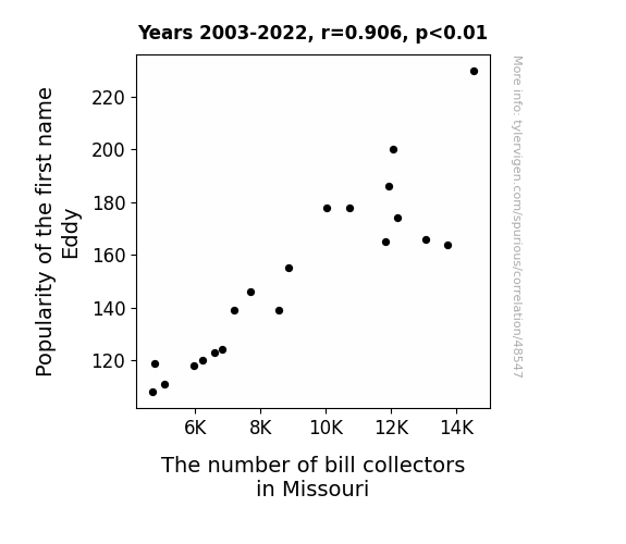 This means 82.2% of the change in the one variable (i.e., The number of bill collectors in Missouri) is predictable based on the change in the other (i.e., Popularity of the first name Eddy) over the 20 years from 2003 through 2022.