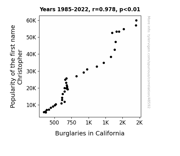 This means 95.7% of the change in the one variable (i.e., Burglaries in California) is predictable based on the change in the other (i.e., Popularity of the first name Christopher) over the 38 years from 1985 through 2022.