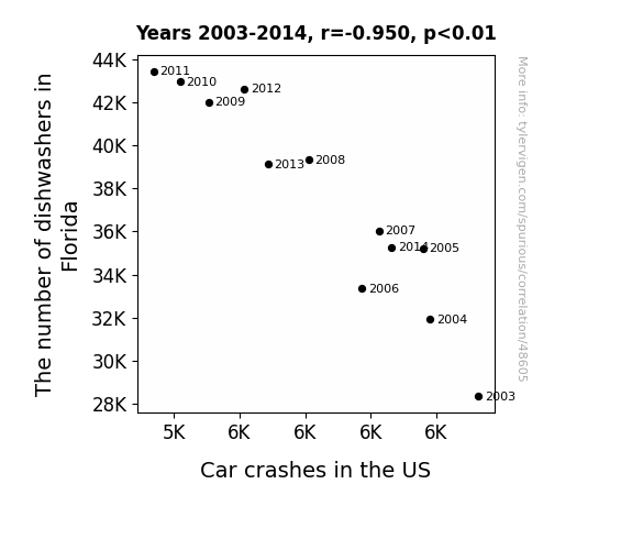 This means 90.3% of the change in the one variable (i.e., Car crashes in the US) is predictable based on the change in the other (i.e., The number of dishwashers in Florida) over the 12 years from 2003 through 2014.