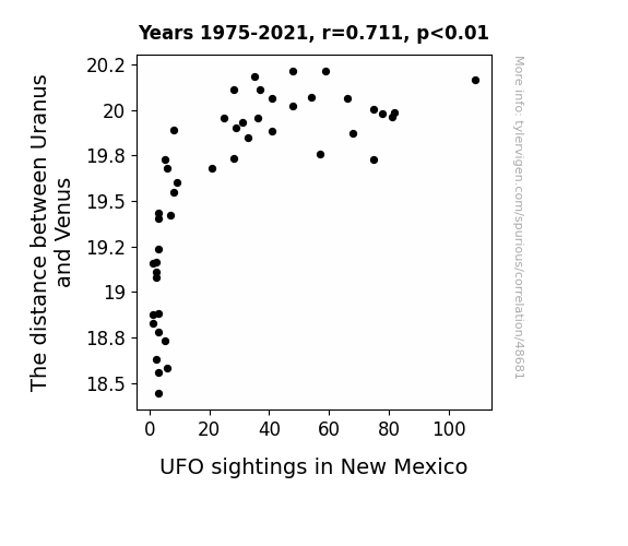 This means 50.5% of the change in the one variable (i.e., UFO sightings in New Mexico) is predictable based on the change in the other (i.e., The distance between Uranus and Venus) over the 47 years from 1975 through 2021.
