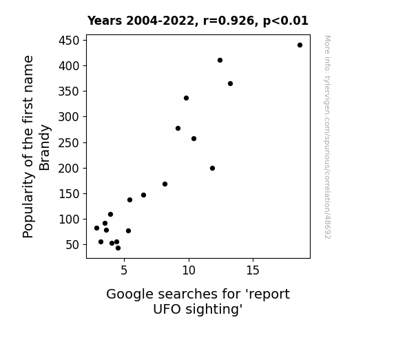This means 85.7% of the change in the one variable (i.e., Google searches for 'report UFO sighting') is predictable based on the change in the other (i.e., Popularity of the first name Brandy) over the 19 years from 2004 through 2022.