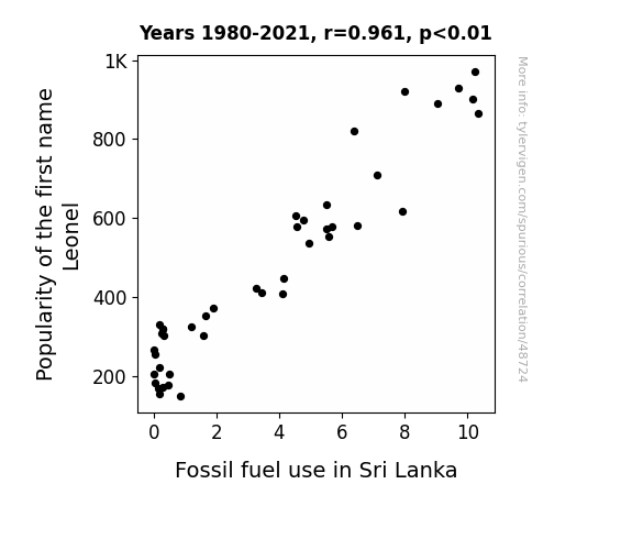 This means 92.3% of the change in the one variable (i.e., Fossil fuel use in Sri Lanka) is predictable based on the change in the other (i.e., Popularity of the first name Leonel) over the 42 years from 1980 through 2021.