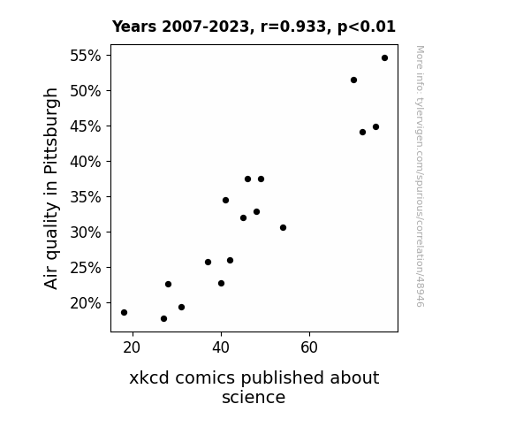 This means 87% of the change in the one variable (i.e., xkcd comics published about science) is predictable based on the change in the other (i.e., Air quality in Pittsburgh) over the 17 years from 2007 through 2023.
