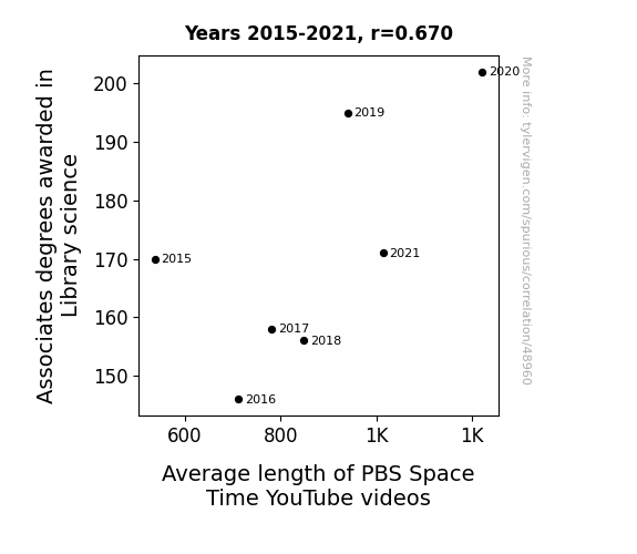 This means 44.9% of the change in the one variable (i.e., Average length of PBS Space Time YouTube videos) is predictable based on the change in the other (i.e., Associates degrees awarded in Library science) over the 7 years from 2015 through 2021.