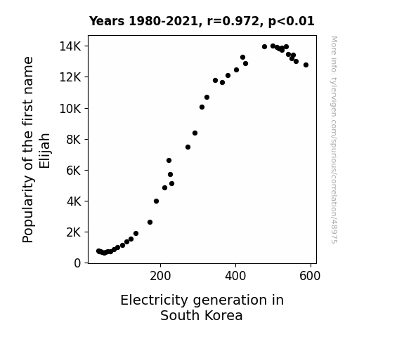 This means 94.5% of the change in the one variable (i.e., Electricity generation in South Korea) is predictable based on the change in the other (i.e., Popularity of the first name Elijah) over the 42 years from 1980 through 2021.