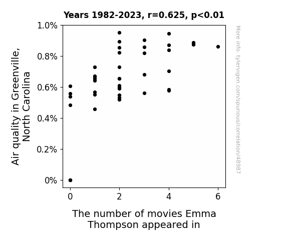 This means 39.1% of the change in the one variable (i.e., The number of movies Emma Thompson appeared in) is predictable based on the change in the other (i.e., Air quality in Greenville, North Carolina) over the 42 years from 1982 through 2023.