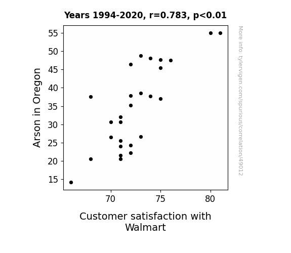 This means 61.3% of the change in the one variable (i.e., Customer satisfaction with Walmart) is predictable based on the change in the other (i.e., Arson in Oregon) over the 27 years from 1994 through 2020.