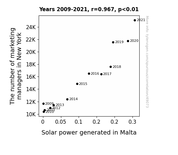 This means 93.6% of the change in the one variable (i.e., Solar power generated in Malta) is predictable based on the change in the other (i.e., The number of marketing managers in New York) over the 13 years from 2009 through 2021.