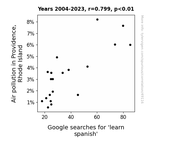 This means 63.9% of the change in the one variable (i.e., Google searches for 'learn spanish') is predictable based on the change in the other (i.e., Air pollution in Providence, Rhode Island) over the 20 years from 2004 through 2023.