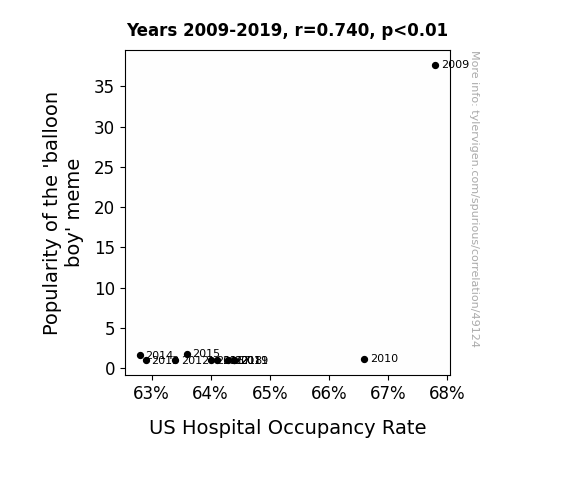 This means 54.7% of the change in the one variable (i.e., US Hospital Occupancy Rate) is predictable based on the change in the other (i.e., Popularity of the 'balloon boy' meme) over the 11 years from 2009 through 2019.