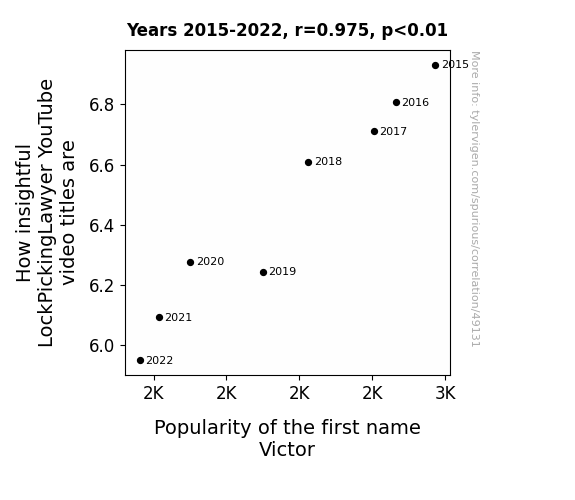 This means 95% of the change in the one variable (i.e., Popularity of the first name Victor) is predictable based on the change in the other (i.e., How insightful LockPickingLawyer YouTube video titles are) over the 8 years from 2015 through 2022.