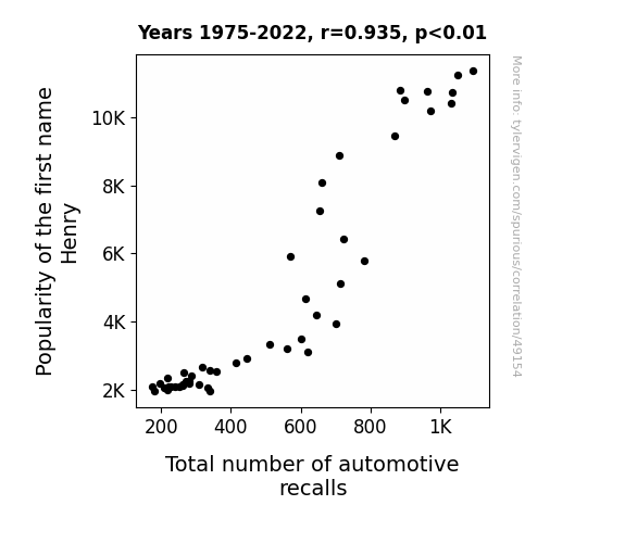 This means 87.4% of the change in the one variable (i.e., Total number of automotive recalls) is predictable based on the change in the other (i.e., Popularity of the first name Henry) over the 48 years from 1975 through 2022.