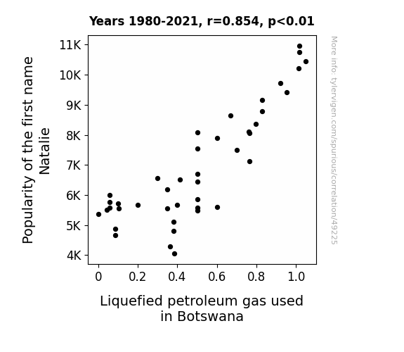 This means 72.9% of the change in the one variable (i.e., Liquefied petroleum gas used in Botswana) is predictable based on the change in the other (i.e., Popularity of the first name Natalie) over the 42 years from 1980 through 2021.