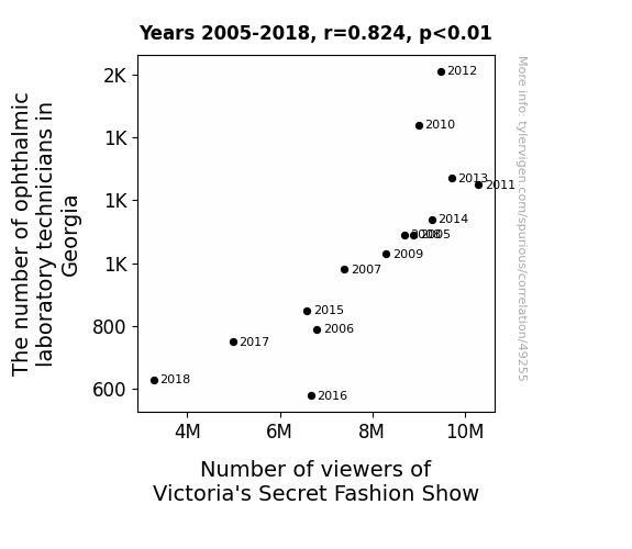 This means 67.9% of the change in the one variable (i.e., Number of viewers of Victoria's Secret Fashion Show) is predictable based on the change in the other (i.e., The number of ophthalmic laboratory technicians in Georgia) over the 14 years from 2005 through 2018.