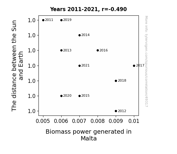 This means 24% of the change in the one variable (i.e., Biomass power generated in Malta) is predictable based on the change in the other (i.e., The distance between the Sun and Earth) over the 11 years from 2011 through 2021.