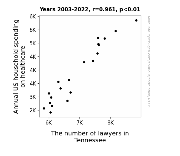 This means 92.4% of the change in the one variable (i.e., The number of lawyers in Tennessee) is predictable based on the change in the other (i.e., Annual US household spending on healthcare) over the 20 years from 2003 through 2022.