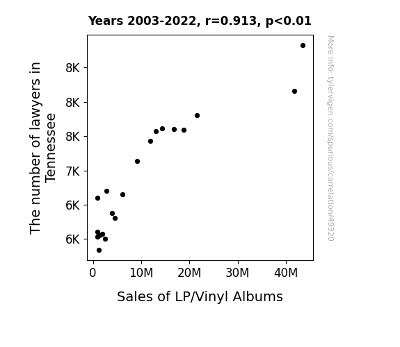 This means 83.3% of the change in the one variable (i.e., Sales of LP/Vinyl Albums) is predictable based on the change in the other (i.e., The number of lawyers in Tennessee) over the 20 years from 2003 through 2022.