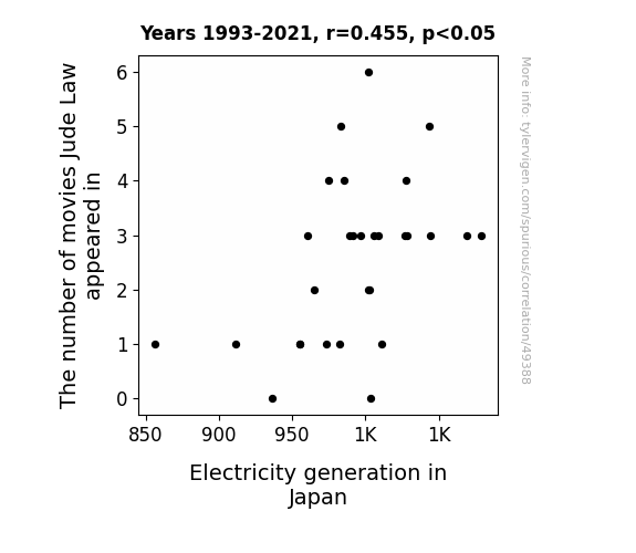 This means 20.7% of the change in the one variable (i.e., Electricity generation in Japan) is predictable based on the change in the other (i.e., The number of movies Jude Law appeared in) over the 29 years from 1993 through 2021.