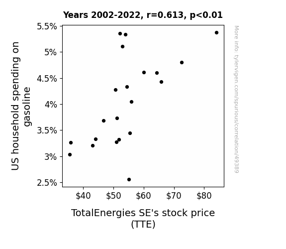This means 37.5% of the change in the one variable (i.e., TotalEnergies SE's stock price (TTE)) is predictable based on the change in the other (i.e., US household spending on gasoline) over the 21 years from 2002 through 2022.