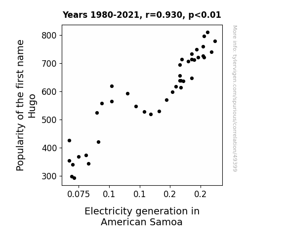 This means 86.6% of the change in the one variable (i.e., Electricity generation in American Samoa) is predictable based on the change in the other (i.e., Popularity of the first name Hugo) over the 42 years from 1980 through 2021.