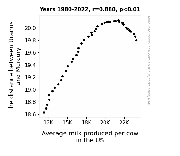 This means 77.5% of the change in the one variable (i.e., Average milk produced per cow in the US) is predictable based on the change in the other (i.e., The distance between Uranus and Mercury) over the 43 years from 1980 through 2022.