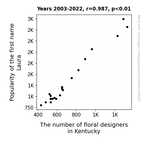 This means 97.5% of the change in the one variable (i.e., The number of floral designers in Kentucky) is predictable based on the change in the other (i.e., Popularity of the first name Laura) over the 20 years from 2003 through 2022.