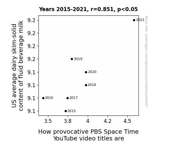 This means 72.4% of the change in the one variable (i.e., How provocative PBS Space Time YouTube video titles are) is predictable based on the change in the other (i.e., US average dairy skim-solid content of fluid beverage milk) over the 7 years from 2015 through 2021.