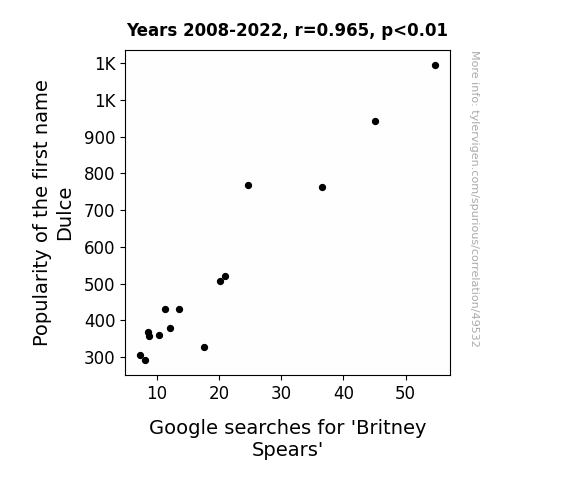 This means 93.2% of the change in the one variable (i.e., Google searches for 'Britney Spears') is predictable based on the change in the other (i.e., Popularity of the first name Dulce) over the 15 years from 2008 through 2022.