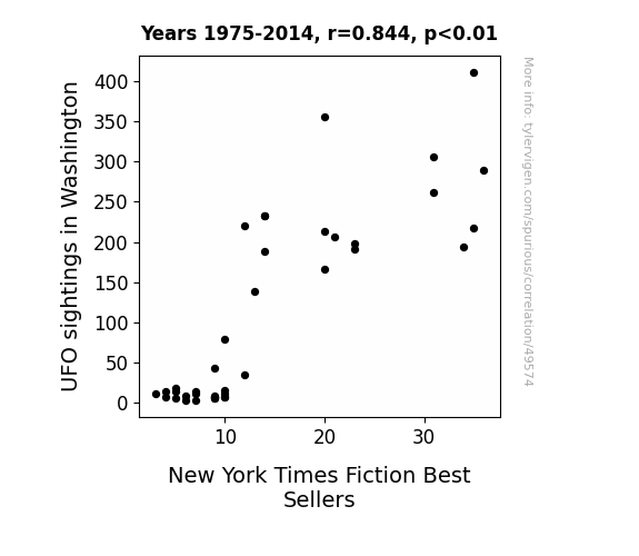 This means 71.3% of the change in the one variable (i.e., New York Times Fiction Best Sellers) is predictable based on the change in the other (i.e., UFO sightings in Washington) over the 40 years from 1975 through 2014.