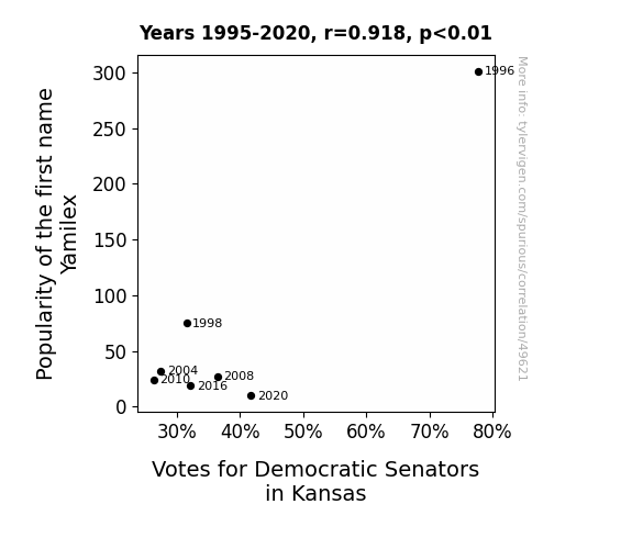 This means 84.2% of the change in the one variable (i.e., Votes for Democratic Senators in Kansas) is predictable based on the change in the other (i.e., Popularity of the first name Yamilex) over the 7 years from 1995 through 2020.
