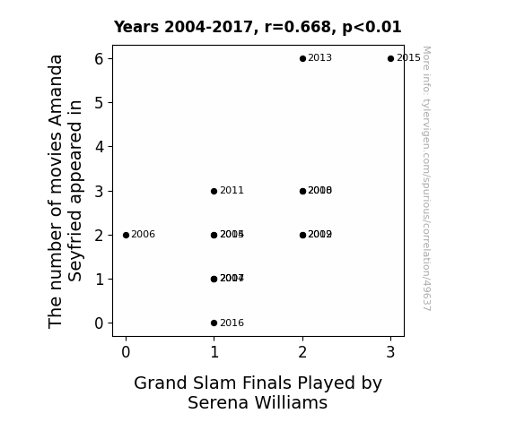 This means 44.6% of the change in the one variable (i.e., Grand Slam Finals Played by Serena Williams) is predictable based on the change in the other (i.e., The number of movies Amanda Seyfried appeared in) over the 14 years from 2004 through 2017.