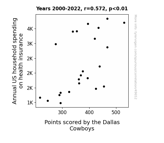 This means 32.7% of the change in the one variable (i.e., Points scored by the Dallas Cowboys) is predictable based on the change in the other (i.e., Annual US household spending on health insurance) over the 23 years from 2000 through 2022.