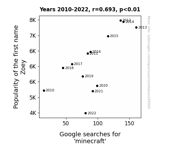 This means 48% of the change in the one variable (i.e., Google searches for 'minecraft') is predictable based on the change in the other (i.e., Popularity of the first name Zoey) over the 13 years from 2010 through 2022.