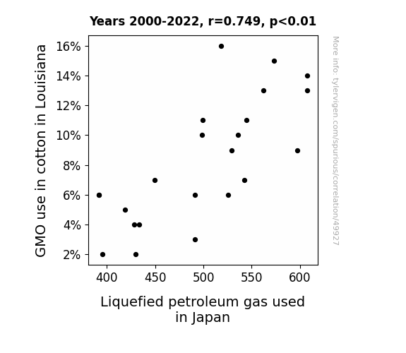 This means 56% of the change in the one variable (i.e., Liquefied petroleum gas used in Japan) is predictable based on the change in the other (i.e., GMO use in cotton in Louisiana) over the 23 years from 2000 through 2022.