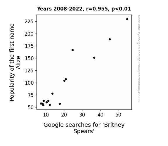 This means 91.1% of the change in the one variable (i.e., Google searches for 'Britney Spears') is predictable based on the change in the other (i.e., Popularity of the first name Alize) over the 15 years from 2008 through 2022.