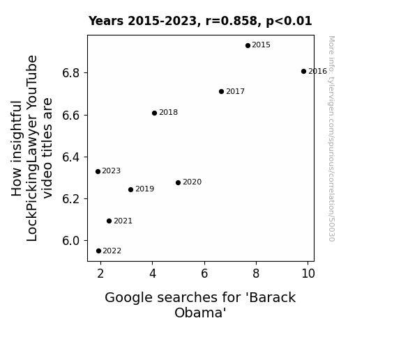 This means 73.6% of the change in the one variable (i.e., Google searches for 'Barack Obama') is predictable based on the change in the other (i.e., How insightful LockPickingLawyer YouTube video titles are) over the 9 years from 2015 through 2023.